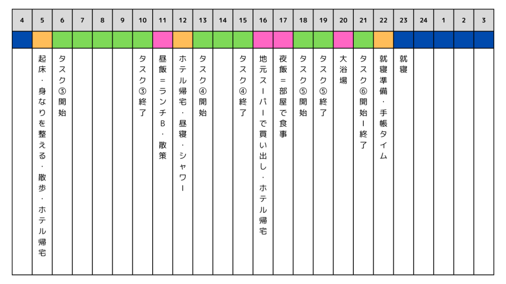 まずは、それぞれの時間でできそうな自分のタスクを割り振って、どのタスク番号の時にやるかを考えておくと、スムーズに仕事に取り掛かることができます。